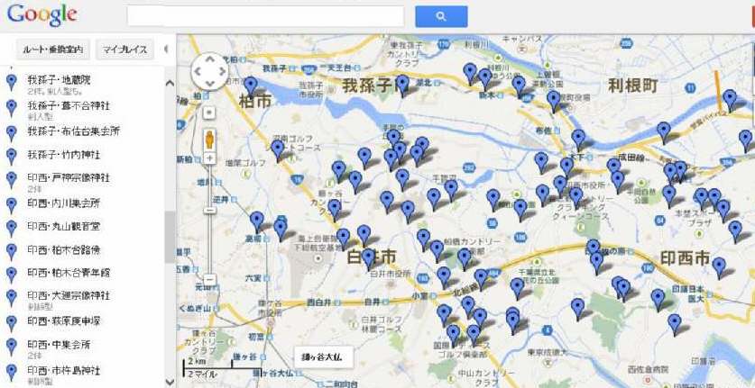 | そんな中で、最近Google社から提供された「マイプレイスによる石仏地図」は、(1)作るのが簡単