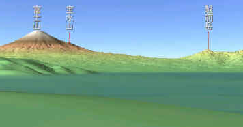 上の連続図は、パソコンソフト「カシミール3D」による作図。 国土地理院の地形図をベースに「風景」を描くソフト。 (カシミールの命名=「可視」+「見る」) 平面地図上で撮影地点とカメラの方向を指定すると、そこから見た風景が表示される。地上からの高さも指定できるので、足場のない中空からの俯瞰図も自由自在である。 地形図がベースなので、工場、家並みなど人工物を排除した風景として描かれる。 江戸時代に見えたであろう風景が必要な東海道研究に最適である。 杉本智彦著 カシミール3D入門 実目次へ業之日本社 2002発行 ¥1800 書店で販売 |