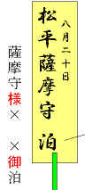 | 関札 大名の名前と泊まりの日付が書いてある。 自分が泊まっていることを示す表札だから、「様」や「御」などの敬語は誤りである。古い映画などでよく間違えている。 到着の10日か2週間前に先発隊が到着して本陣主人に関札を手渡しそれで大名が本陣に泊まる契約が成立したことになる。 |
