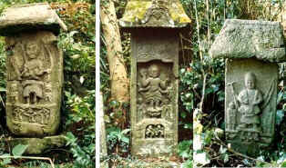 | 1.片手サル石工 延宝8年、湯河原出身のある石工が鎌倉付近に移住し、多くの青面金剛を作成した。三猿のデザインに特長があり、それを手がかりに全作品の一覧を作成した。初期の作品のデザインを順番に並べると、 @ 4手夜叉 延宝8年1月 (鬼のパンツ) ABCD 4手明王 延宝8年8月〜12月 (明王の衣装) EF 6手(放射状の手)明王 延宝9年〜 G以降 6手合掌型(標準) 翌々年〜 田舎から出てきて、何も知らなかった石工が、少しづつ上記のルールの情報を入手していることが分かる。 |