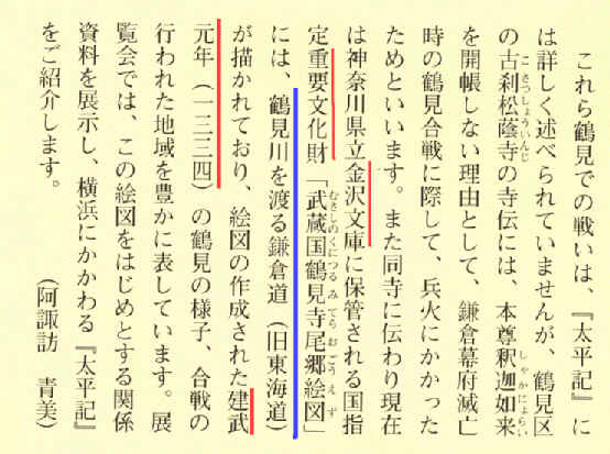 | 横浜歴史博物館ニュース(2007/10月号)「企画展「太平記に見る横浜」によせて」記事に掲載された鶴見区の「寺尾郷絵図」(1334