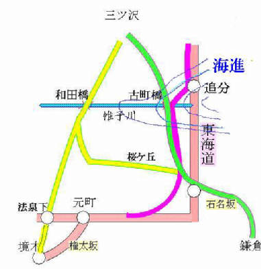 | ◎この後期鎌倉道=鎌倉時代の鎌倉道と考えるのが現在の定説であるが、海面レベルを考慮に入れるとこれは間違いで、鎌倉時代の鎌倉道は古町橋を通れず、桜ケ丘の山上を通っていた。 |