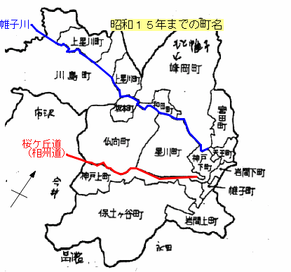 | 「和田村:南方に相州道あり。仏向村より入り帷子町に通ぜり。この道村内を通ずること四百間余」 ここに出てくる村々の位置関係についても次のようにきちんと書かれて折り、上右図の昭和初期の町名と一致している。(峰岡町=旧帷子町) 「和田村:東西北の三方は帷子町に境い、南の一方は仏向、下星川に隣り・・」 「仏向村:和田村に隣り、帷子川を境とす」 相州道は仏向村から帷子川を渡って北岸に移るので、南岸の星川は通らないのである。 横浜市教育委員会「横浜の古道」のミス 「横浜の古道」には、相州道が星川を通過するような図が掲載され、諸資料にも引用されているが、明治以降の地名の変化(帷子、星川、神戸、和田)を知らずに江戸時代の文書の記事を読んだことによる初歩的なミスである。 更に「横浜の古道」を単純に引用した資料、記事、掲示類(区役所前案内板、市民グラフ、図書館月報・・・)も、すべて間違いである。(別項) 追分から来て和田で対岸に渡った相州道は、坂本〜市沢〜三反田〜二俣川(厚木、八王子道)へと向かう。 保土ヶ谷は武蔵の国のはずれであり、どちら方向に歩いても相模に出ることになる。厚木方面も相州だが、戸塚も鎌倉も金沢も全部相州である。「相州道」と言っただけではどの方向を指すのか分からないため地元では実用的な言葉ではなかったらしく、途中の道しるべには「相州道」ではなく、逆方向を示す「神奈川道」「保土ヶ谷道」「弘明寺道」が使われている。 武蔵国風土記稿の記事でも仏向と坂本ではこの道の続きが「八王子道」と記されている。保土ヶ谷付近の「八王子道」が帷子川の北岸と南岸とに2本あったことについてあまり知られていないので注意しておいてほしい。 |