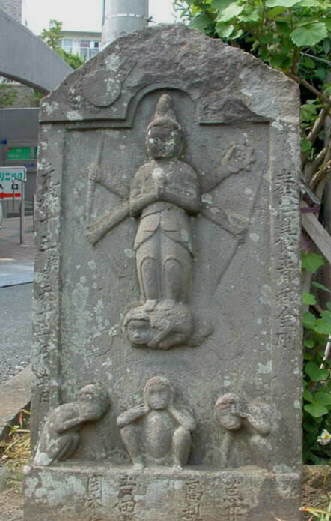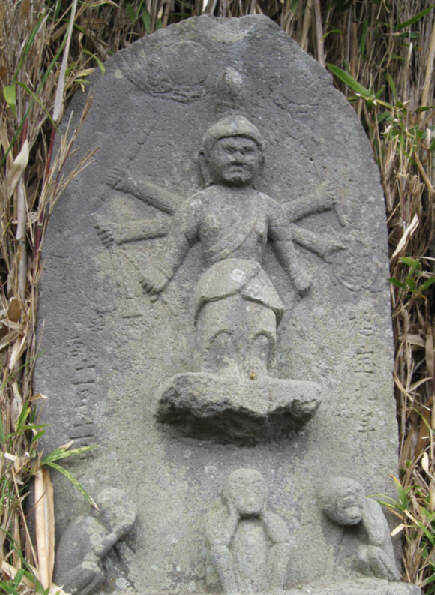 | 「三猿が居る?〜青面金剛座像?」などと言われたが、右との対比で馬頭観音であることが分かる。 |