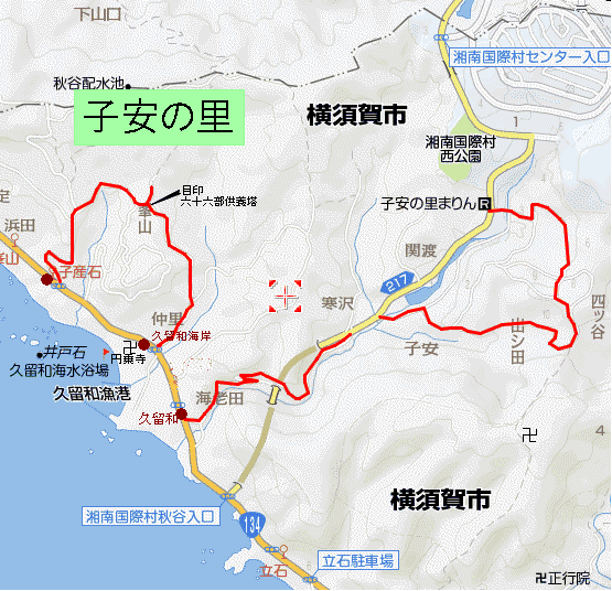 | 子安の里は、車の通りの多い134号線から一歩入ったところにある静かな山村の軽いハイキングコースとして昔から有名。 国際湘南村からの新道が通過するようになったため、一部が少し様変わりした。 石仏は社寺ではなくほとんど路傍にあり、村の山道はかなり入り組んでいるため、オリエンテーリング的な探索を楽しむことになる。 「日本の石仏」号のリレー石仏案内「横須賀市秋谷の石仏」(遠藤茂)を下敷きにしたが、新道の開発に合わせて回る順序を変更した。 |