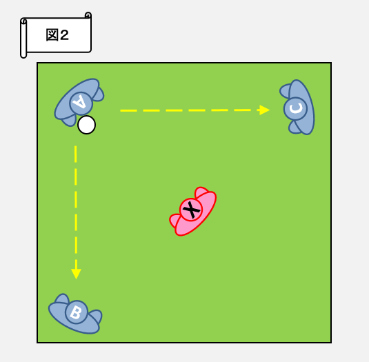 上記の悪い例のようにならないためには、プレーヤーBにボールが渡った時にパスコースが二つあるようにします。