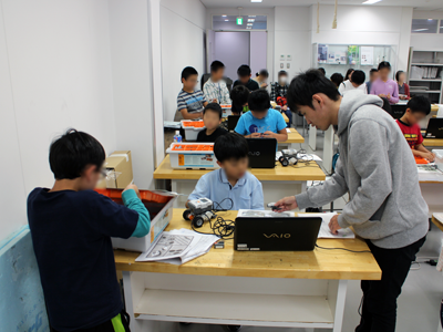 公開セミナーV「ロボットで遊ぼう!」の第二回が開催されました。講師は、創生デザイン学科の内田准教授。アシスタントは、創生デザイン学科3年生の岩渕美紀さん、君塚夏季さん、金原康介くん、高岸英次くん、濱田傑くん、丸山拓海くん。参加者は近県の小学生28名でした。第一回目と同様に、今年のテーマは、「お相撲ロボットをつくろう」でした。皆さん、初めての体験でしたが、自分で作ったロボットが土俵の上で動き始めると、大きな歓声で応援を始め大興奮でした。勝った人も負けた人も、たくさんの笑顔で感動してくださいました。ご参加いただきまして、本当に有り難うございました。