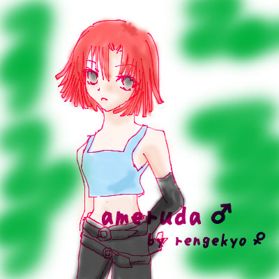 わーい☆ アメルダさんを描いちゃった☆ 結構疲れた気がします。。(〃´ー`)=3ふう 使った材料はphotoshop&pixiaです☆ なんか上着の色違うような。 ぢつはアニメ見てないんです。。。ああ叩かないで。 きゃあ紅蓮何するの!それはボンバー君2号じゃないか!(ねたはオーフェンから) とにかく。私も何とか見ようと思います。 WJ画に戻る
