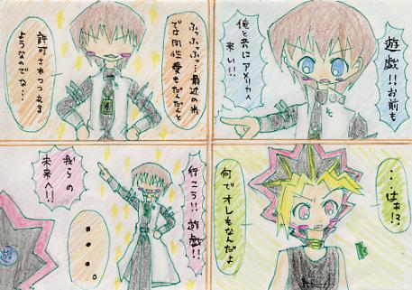 紅蓮の超!!!へぼ漫画です・・・J(汗) 色鉛筆だし・・・おい! でもってネタは歴史の先生が言ってた事を参考にしました(笑)。 同じ学校の同じクラスの人なんかは解かるかも!? その先生に関してホモ説が流れて・・・そっから発展したお話でした(笑)。 うーーー。それより私の絵が・・ひどいなぁ・・・J(汗) んでもって社長のキャラが・・・壊れてるよっっっJ(汗) WJ画へ戻る