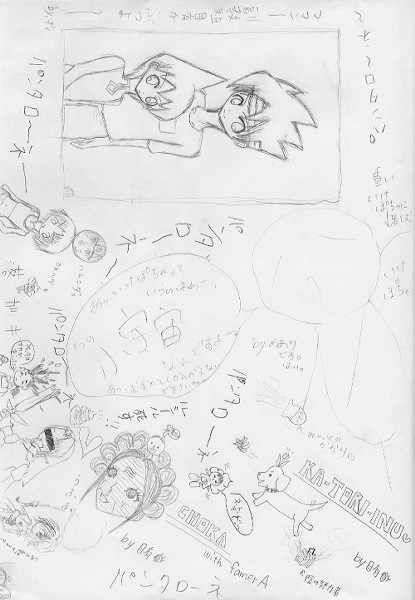 ・・・・・・・・・・????? 紅蓮も一緒に描いたので何ともいえません(笑)。 といっても紅蓮はまともに描いてたのに〜〜〜!!!??? ちょっとモノもらいものは…あはは…ですね(笑)。。。 でも…まぁ… Thanksね☆ラクガキしてくれて♪ 紅蓮 ぎふとに戻る