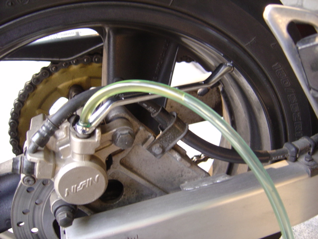 チューブの片方はブリーダー(フルードを抜くところでキャリパーに上向きに付いていてゴムのキャップが被せられている)に刺します。