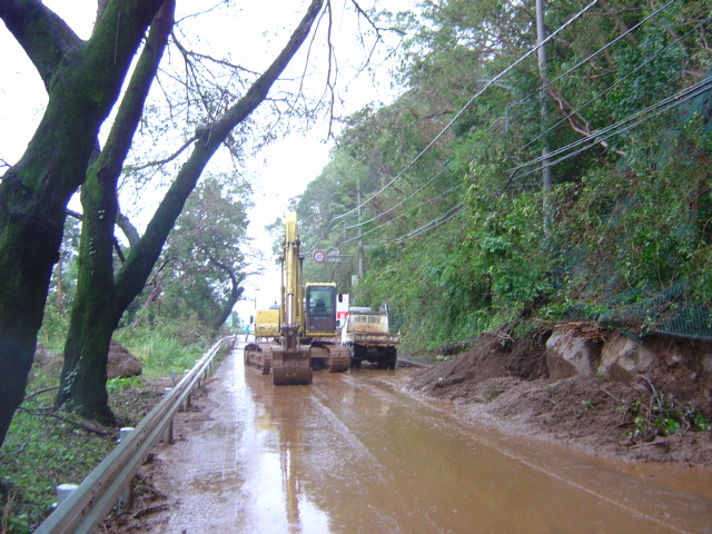 土砂崩れの現場。このアスファルト一面を覆った土・・・。アスファルトが見えません。