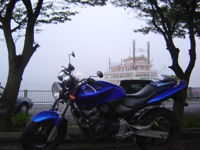 芦ノ湖・遊覧船をバックにパチリ。勿論のことですが霧で対岸が見えない;;